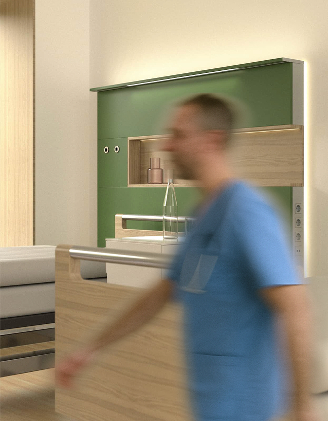 Der Raum hat großen Einfluss auf das Wohlbefinden und die Genesung des Patienten. Wir schaffen Räume der Ruhe. Unsere Produkte verschmelzen mit der Architektur zu einer Einheit, zu integrativen Raumkonzepten, die das Krankenzimmer visuell beruhigen – bei maximaler Funktionalität und Ergonomie für Personal und Patienten.
